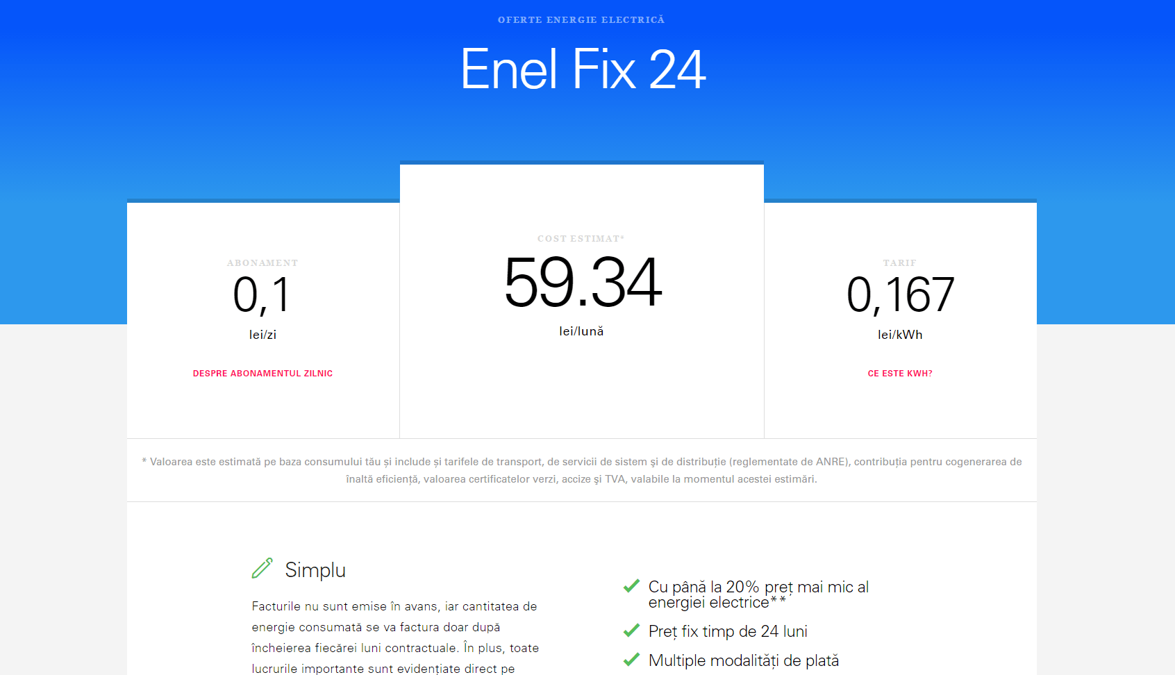 Mi se pare foarte important că poți afla în mai puțin de un minut exact ce abonament se potrivește nevoilor tale și care este suma lunară pe care o să o plătești (valoarea estimată). Valoarea este calculată pe baza consumului tău și include și tarifele de transport, de servicii de sistem şi de distribuţie (reglementate de ANRE), contribuţia pentru cogenerarea de înaltă eficienţă, valoarea certificatelor verzi, accize şi TVA, valabile la momentul acestei estimări. Atenție! Profitați acum de oferte, majoritatea sunt valabile doar până pe 31 ianuarie.