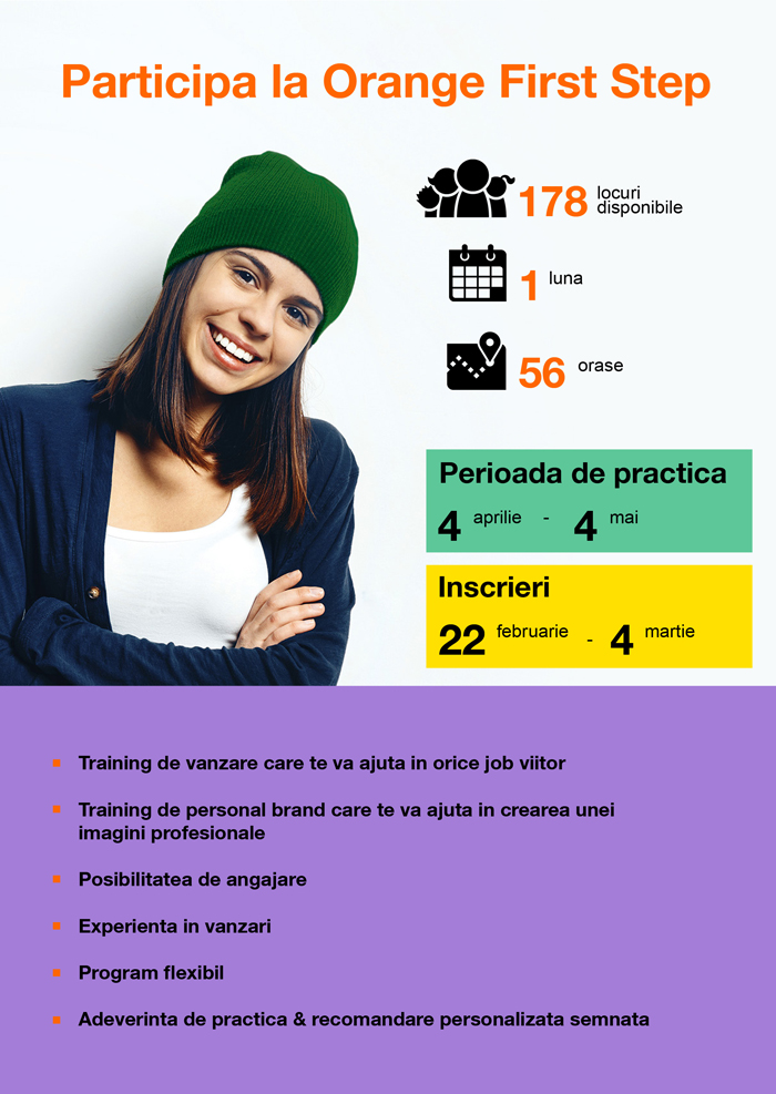 Orange First Step se va desfășura în perioada 4 aprilie – 4 mai. Înscrierile se pot face pe www.orange.ro/first-step, de astăzi până pe 4 martie, urmând ca din 5 până în 25 martie să se desfășoare perioada de selecție si anunțarea candidaților.