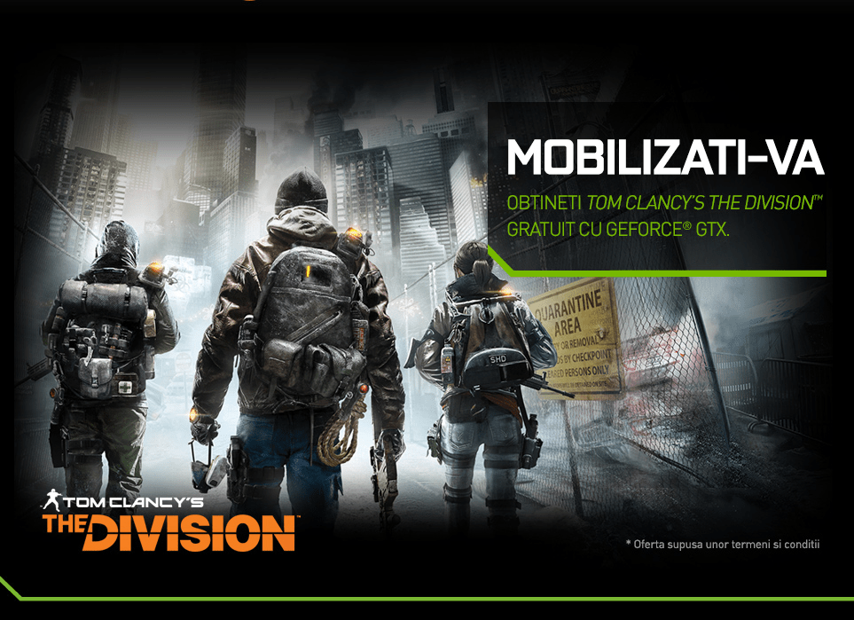 Dacă faci upgrade la o placă grafică GeForce GTX 970 sau un model superior, sau achiziționezi un notebook cu GeForce GTX 970M sau un model superior, vei primi gratuit o copie a jocului „Tom Clancy’s The Division”. Jocul va fi trimis în format electronic în maxim 5 zile lucrătoare de la finalizarea comenzii pe site-urile partenere.