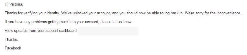 trebuie sa raspunzi pe mailul inregistrat pe facebook, ai acolo un formular si mai multe detalii de la Facebook. Altfel nu poti